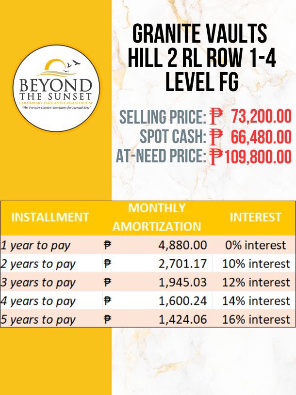 Home Vaults HILL 2 ROAD LEVEL ROW 2 FG HILL 2 ROAD LEVEL ROW 2 FG₱60,000.00 Choose Plot Location Choose an optionRL-R2-F1RL-R2-F2RL-R2-F3RL-R2-F4RL-R2-F5RL-R2-F6RL-R2-F7RL-R2-F8RL-R2-F9RL-R2-F10RL-R2-F11 HILL 2 ROAD LEVEL ROW 2 FG quantity Purchase This Plot SKU: N/A Category: Vaults Description Related products Hill 1 B1 – Row 3 LEVEL CDE REGULAR VAULTS (4 Urns Capacity)Vaults, Regular Granite Vaults ₱55,000.00 Select options This product has multiple variants. The options may be chosen on the product page Hill 1 B3 – Row 10 LEVEL CDE REGULAR VAULTS (4 Urns Capacity)Vaults, Regular Granite Vaults ₱55,000.00 Select options This product has multiple variants. The options may be chosen on the product page Hill 1 B2 – Row 4 LEVEL ABF REGULAR VAULTS (4 Urns Capacity)Vaults, Regular Granite Vaults ₱50,000.00 Select options This product has multiple variants. The options may be chosen on the product page Hill 1 B1 – Row 1 LEVEL CDE REGULAR VAULTS (4 Urns Capacity)Vaults, Regular Granite Vaults ₱55,000.00 Select options This product has multiple variants. The options may be chosen on the product page